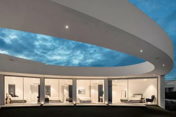 這種平衡感貫穿于整個(gè)建筑,橢圓形基底與漂浮在室外天井區(qū)域之上的洞口形成極大的反差,創(chuàng)造了積極空間和消極空間、密度與通風(fēng)、明與暗之間的動(dòng)態(tài)關(guān)系。