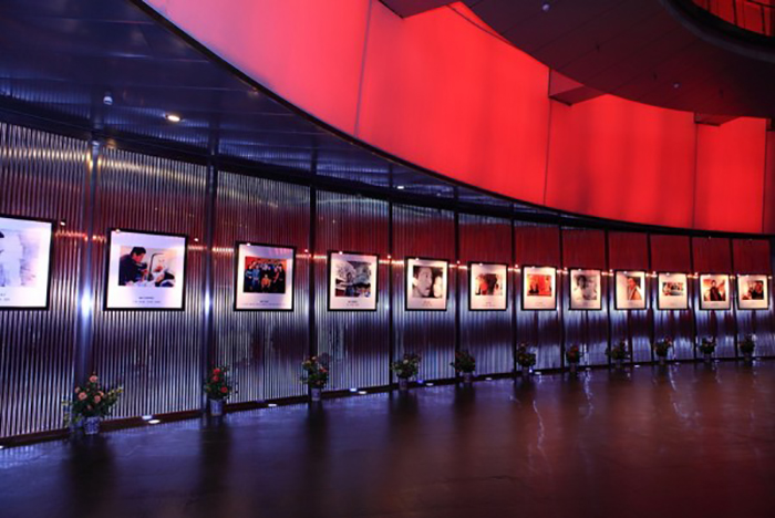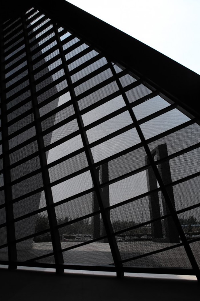 中國(guó)電影博物館的建筑外觀不僅氣勢(shì)宏偉,而且充滿(mǎn)了獨(dú)特的藝術(shù)特色。在主體建筑的前方,巨大的銀幕與廣場(chǎng)上一道斷續(xù)的斜墻構(gòu)成了形如咔打板的平面組合。建筑采用黑色作為基礎(chǔ)色,并使用鏤空?qǐng)D案的金屬板作為外層裝飾,為這座光影的殿堂蒙上了神秘的面紗。在統(tǒng)一、中性的黑色背景上,四個(gè)立面根據(jù)建筑的內(nèi)部公共空間的位置分別開(kāi)辟一片大型彩色玻璃面。紅、綠、藍(lán)、黃分別代表的展覽、博覽、影院、綜合服務(wù)四個(gè)中國(guó)電影博物館大廳功能區(qū)域流露出多彩的個(gè)性。