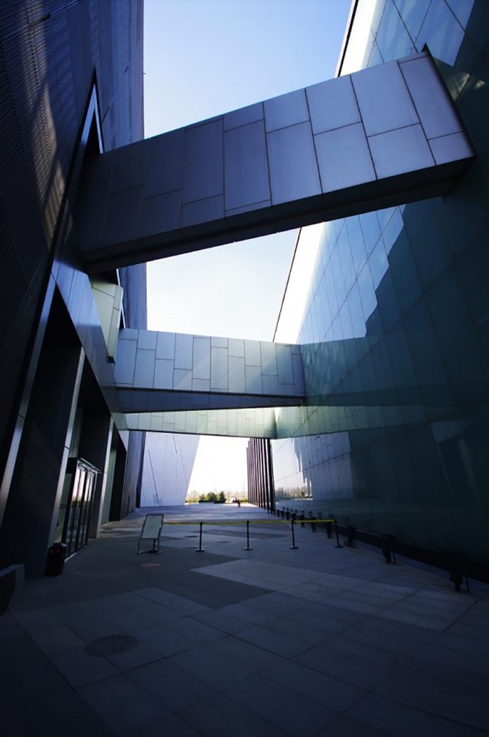 與一般經(jīng)驗(yàn)中博物館不同的是,中國(guó)電影博物館遠(yuǎn)離城市中心,處于北京東北郊尚在規(guī)劃中的北京影視城范圍內(nèi)。建筑先以一面巨大的屏幕面對(duì)來(lái)訪的參觀者。一行角度漸變的高大的幕墻和框架橫亙?cè)趶V場(chǎng)之上,形成一道切入廣闊空間的視覺(jué)界面,以通俗而具表現(xiàn)性的方式宣示建筑的存在。由此劃分開(kāi)的前后兩處空間透過(guò)墻體片段的多處間隙相互滲透,參觀者自主選擇穿過(guò)位置。這種方式打破了突出某一主要入口路徑的慣常做法,暗示進(jìn)入電影欣賞經(jīng)歷的多重可能方式。