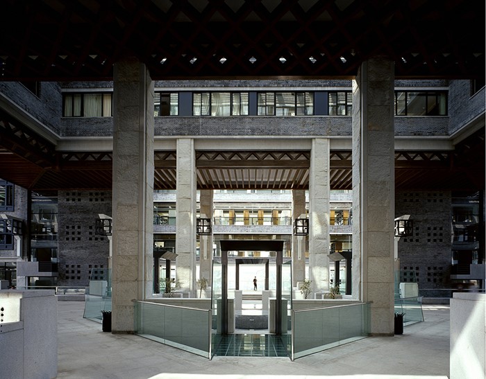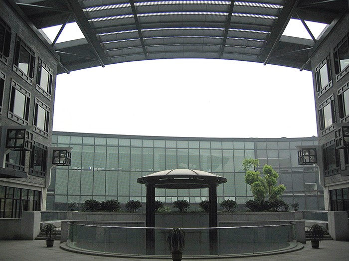 新校區(qū)在群體布局上強(qiáng)調(diào)“通”、“透”、“空”,強(qiáng)調(diào)與景園共享相融的復(fù)合建筑空間構(gòu)成,借用江南建筑特有的高墻、深院、窄巷等處理手法,引導(dǎo)縱深的可視層次,使校園環(huán)境的致密與通透達(dá)成一種多變的對(duì)比和反差,使人們領(lǐng)略空間的開(kāi)放與流暢。以適應(yīng)地域性自然人文環(huán)境、富有傳統(tǒng)建筑文化特色的方式,化解了用地狹小、建筑密度過(guò)高所易于導(dǎo)致的空間擁堵感。