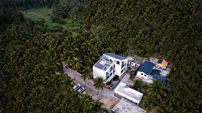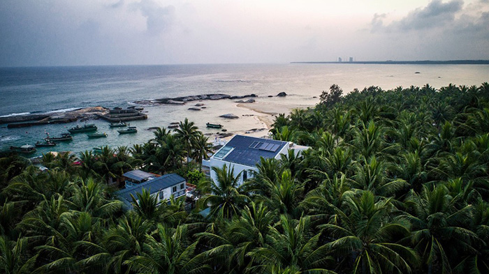 龍樓鎮(zhèn)是一個(gè)擁有深厚歷史文化的縣鎮(zhèn),民宿建筑外形的靈感便是來(lái)源于傳統(tǒng)居民建筑的坡屋頂這一形態(tài)。民宿的南立面的形狀就像中間切開(kāi)的傳統(tǒng)民居的剖面,左右高低不對(duì)稱的兩個(gè)體塊形成節(jié)奏變化。民宿的屋頂也沿用了鋪設(shè)瓦片的形式。在色彩與形式上都與當(dāng)?shù)貍鹘y(tǒng)建筑形成聯(lián)系與呼應(yīng)。一層圍墻使用了毛石飾面,自然粗糙的毛石質(zhì)感與白墻的光潔產(chǎn)生了材質(zhì)間的碰撞與對(duì)比。毛石更是一種十分具有海南特色的石材。我們?cè)诒A魝鹘y(tǒng)地域特色的基礎(chǔ)上設(shè)計(jì)簡(jiǎn)潔外形、功能多樣的居住民宿。青瓦白墻結(jié)合簡(jiǎn)潔的外輪廓,在這海邊既不失色也不突兀。