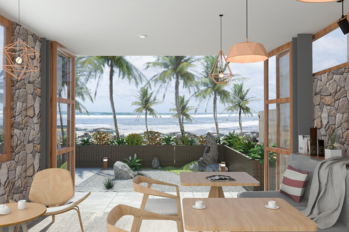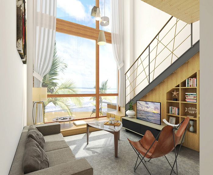 民宿南向墻面大面積打通,安置落地玻璃,設(shè)置陽(yáng)臺(tái),不僅保證了最大程度的光照還保證了住戶最大程度觀賞到南向的海景。