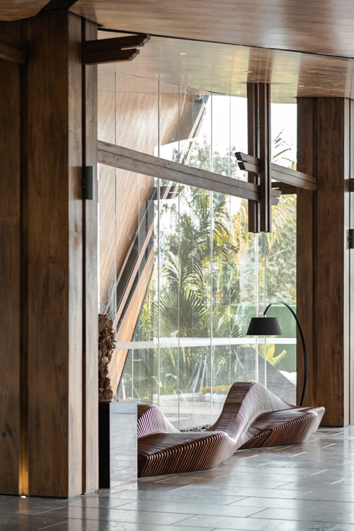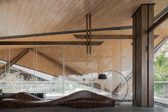建筑設(shè)計(jì)通透開放,自由的屋頂結(jié)合靈活的異形結(jié)構(gòu),同生機(jī)勃勃的自然環(huán)境相融共生。室內(nèi)延續(xù)建筑所賦予的意義,以其為載體,在室內(nèi)空間延展、重組,詮釋其所構(gòu)成的涵義。
