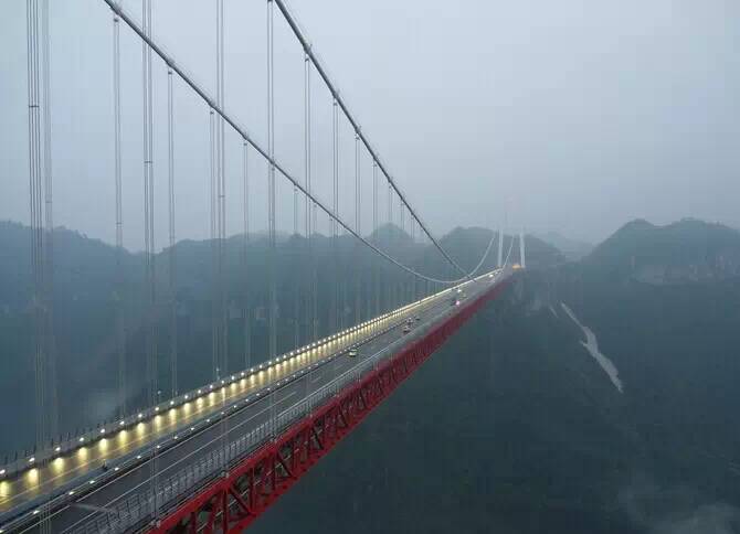 矮寨特大懸索橋,位于湖南湘西矮寨鎮(zhèn)境內(nèi)。矮寨懸索橋,距吉首市區(qū)約20公里,跨越矮寨鎮(zhèn)附近的山谷,德夯河流經(jīng)谷底,橋面設(shè)計標高與地面高差達330米左右,全長1073.65m,懸索橋的主跨為1176m。該橋跨越矮寨大峽谷,主跨居世界第三、亞洲第一。