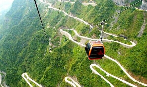 張家界天門山盤山公路有"通天大道"之稱,盤山公路全長10.77公里,海拔從200米急劇提升到1300米,大道兩側(cè)絕壁千仞,空谷幽深,共計99個彎,180度急彎此消彼長,似玉帶環(huán)繞,彎彎緊連,層層迭起,被譽為“天下第一公路奇觀”。